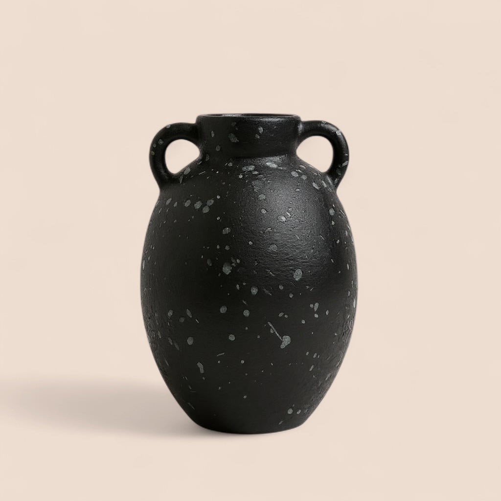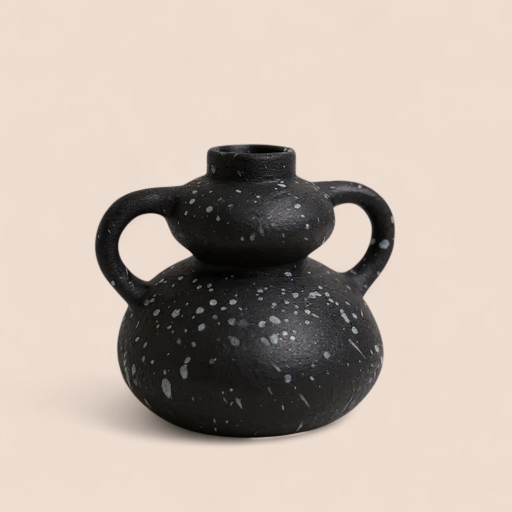 A modern pair in matte black with a soft speckled finish. Blackstone Duo includes two ceramic vases—one tall and narrow, one low and rounded—designed to complement each other with contrast and balance. Sculptural on their own or styled with dried stems. Sold as a set.