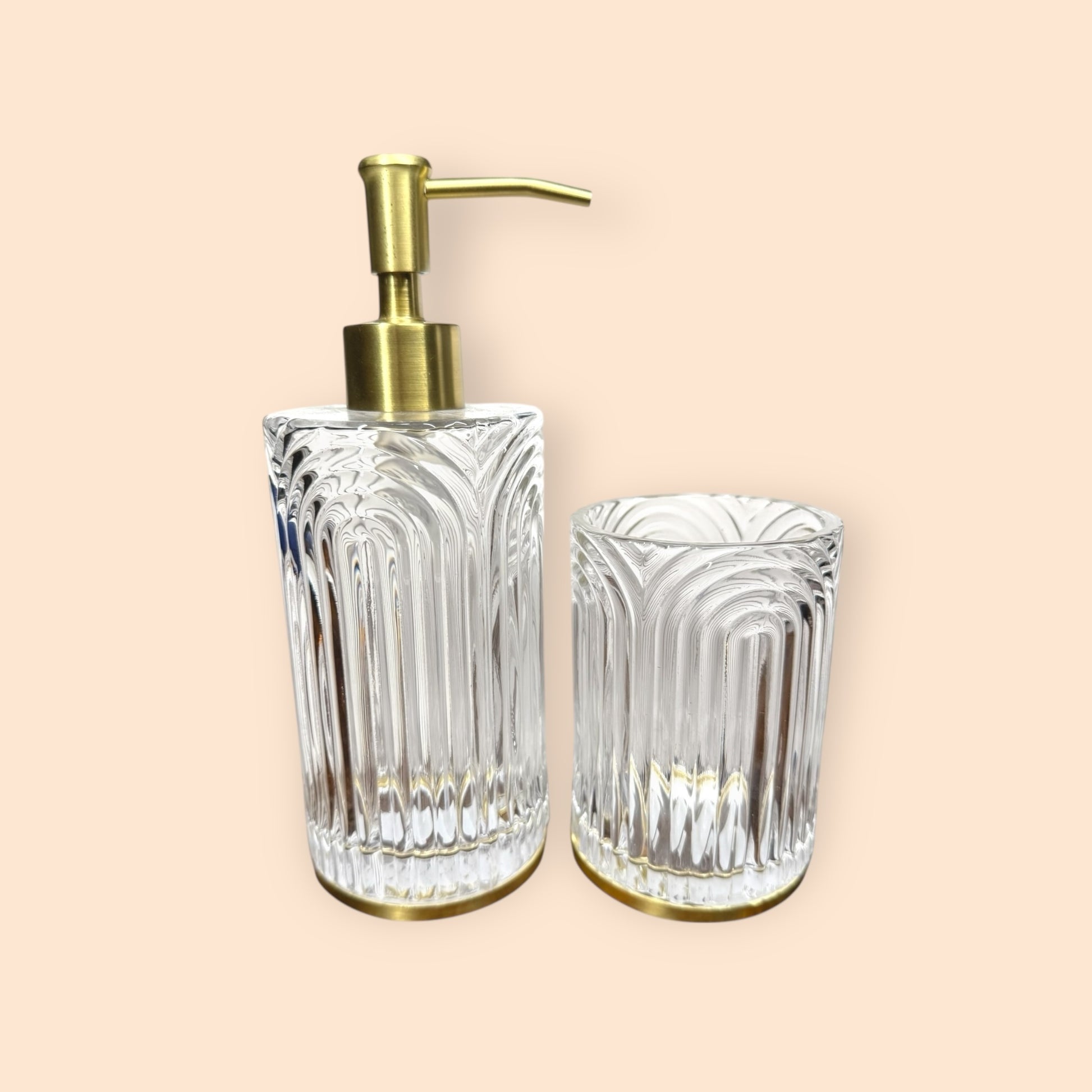 Elevate everyday rituals with this luxe glass and gold duo. Featuring a ribbed glass soap dispenser and matching tumbler, this set adds instant elegance to any bathroom or vanity. Chic, timeless, and oh-so-satisfying to use — because countertop deserves some effortless glam.