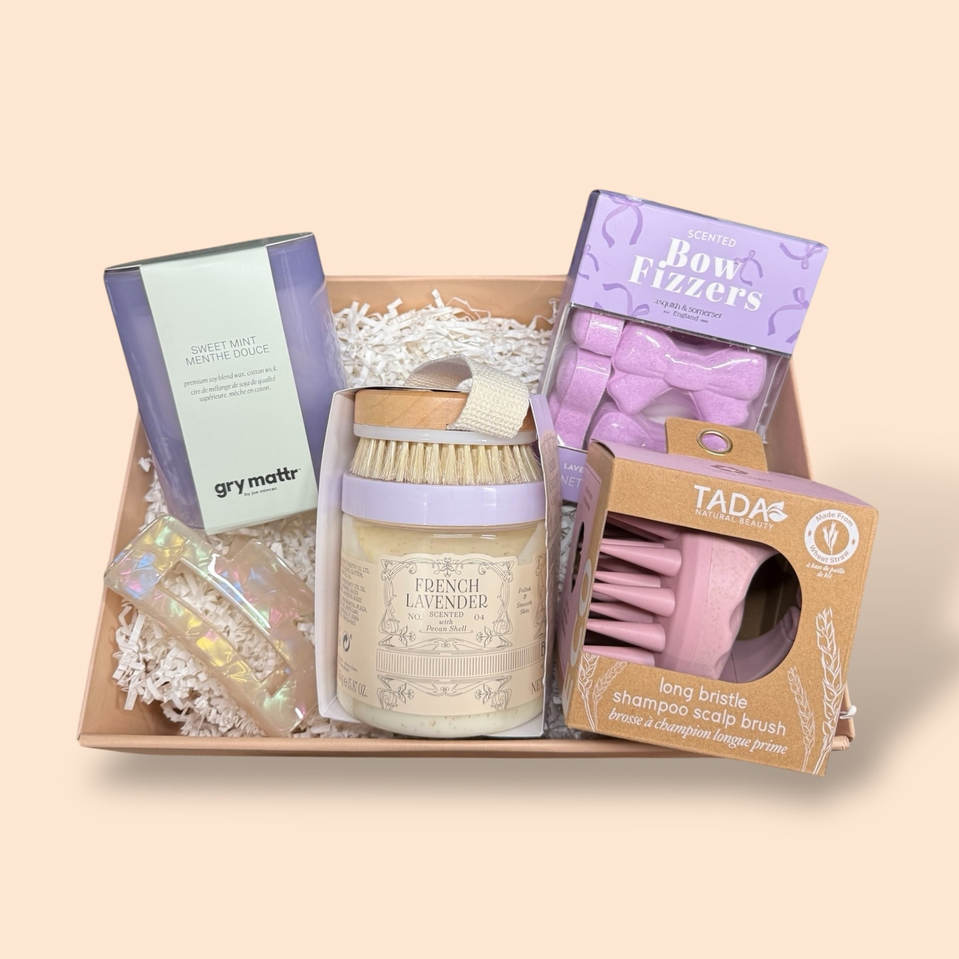 Unwind in style with Lavender Haze, a thoughtfully curated gift bundle designed to soothe the senses. From the calming scent of French lavender and sweet mint tea to pampering essentials like a shampoo scalp brush, fizzy bath bows, and an iridescent claw clip, this set turns any moment into a mini spa day. A beautiful way to say “you deserve this.”