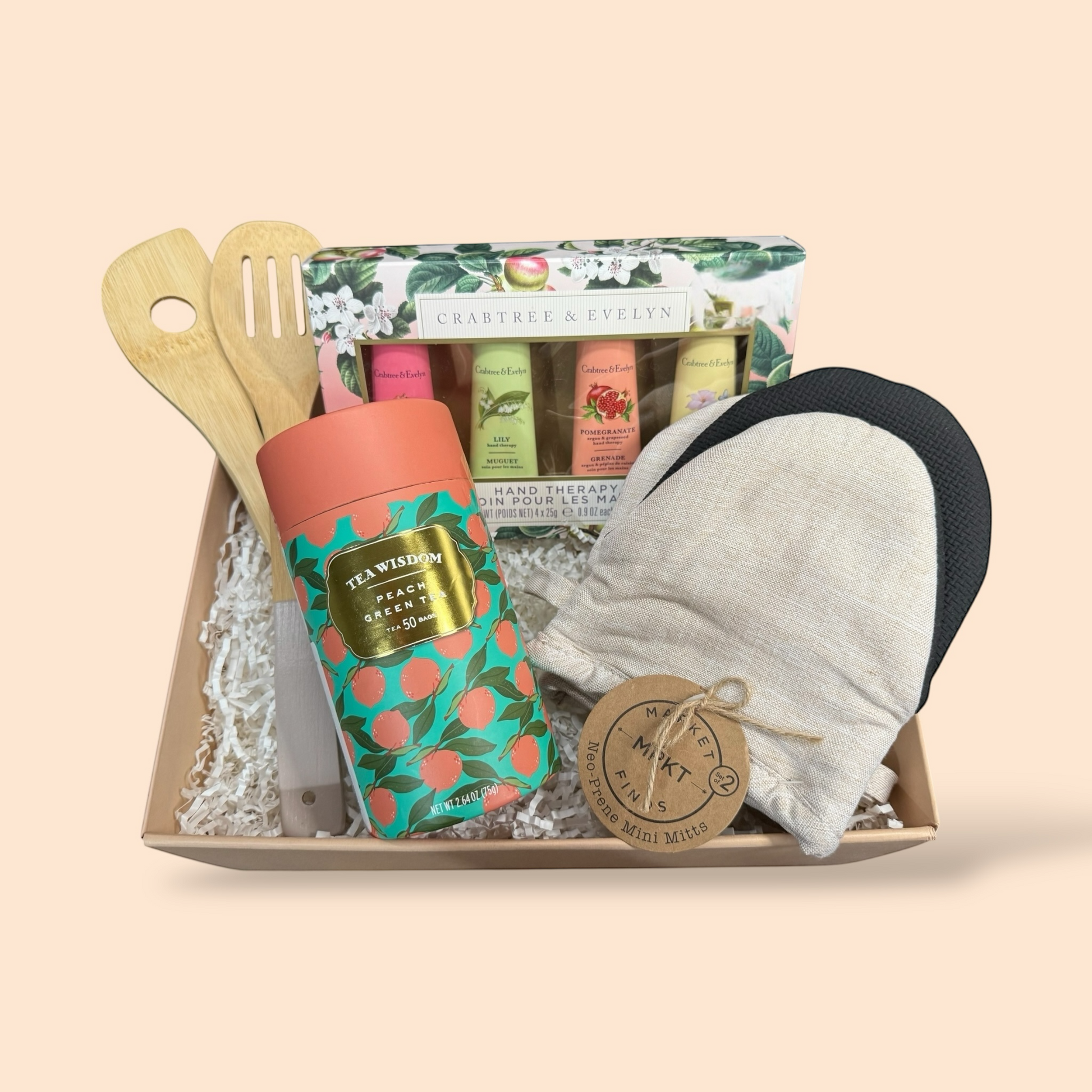 Everything about this bundle is made for slow, sunny mornings in the kitchen - picture the kettle on, something delicious baking in the oven, and warm sunshine pouring through the window. With peach green tea, wooden utensils, oven mitts, and a Crabtree & Evelyn nourishing hand cream set, it’s made for full hearts, relaxing moments, and well-pampered hands.