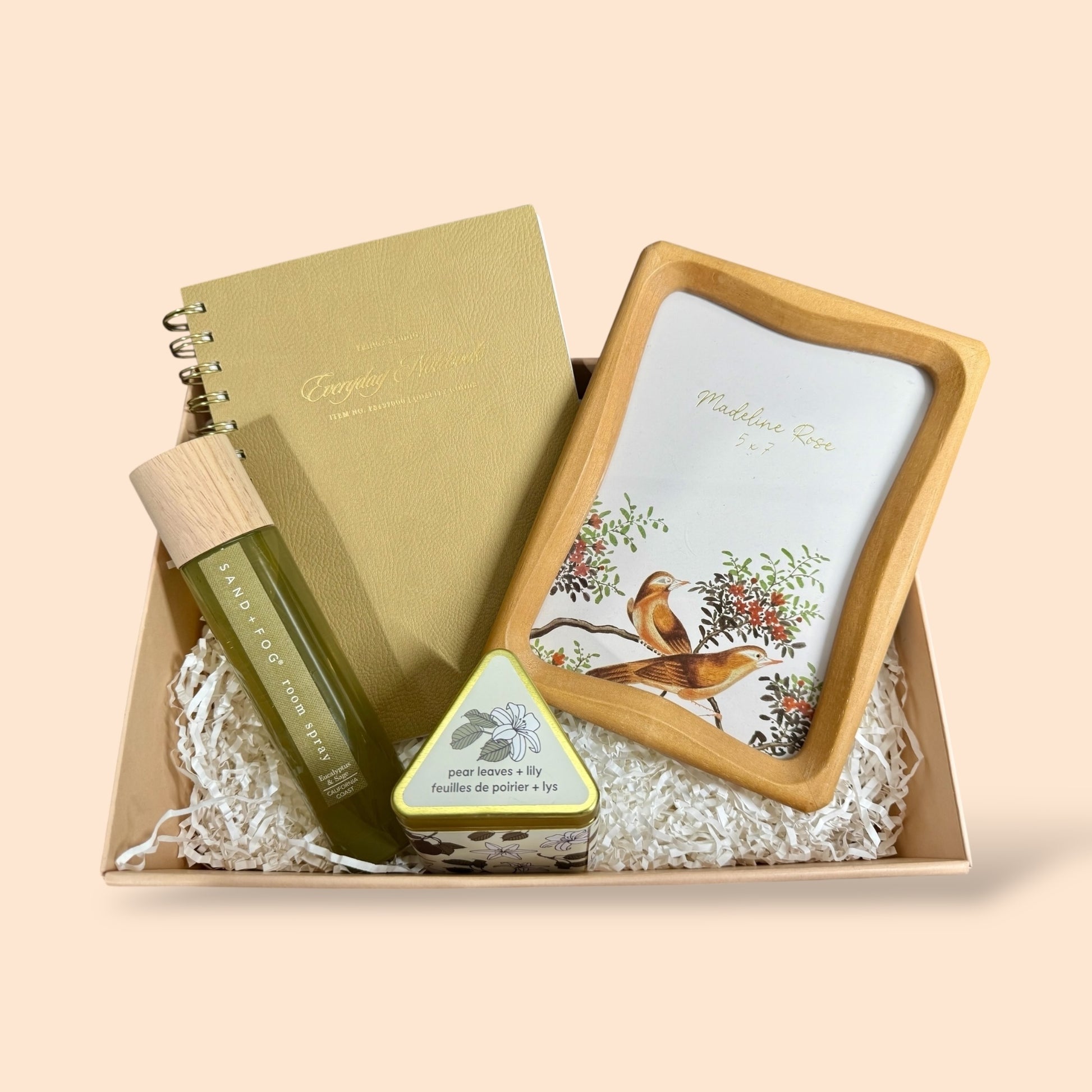 Soothing hues, sweet scents, and meaningful moments — this bundle brings elegance with a dash of nostalgia. Includes a luxe sage journal, pear & lily candle, natural eucalyptus and sage room spray, and a wooden photo frame with bird motif to preserve a special memory.
